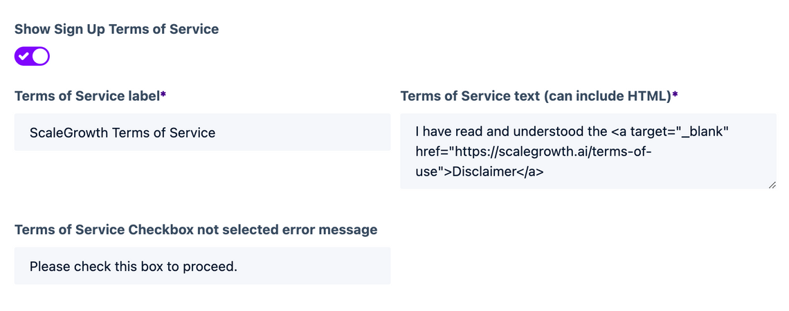 - note that you can also customize the Terms of Service Checkbox not selected error message here