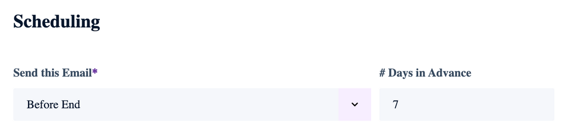 Before StartorBefore Endas desired - Enter the desired # Days in Advance you want to to notify the users before the Start or End time