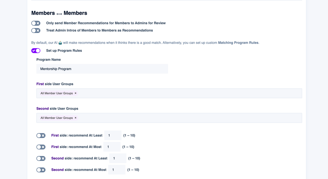 First side User Groups and Second side User Groups – These let you target or restrict your Custom Matching Program to only specified User Groups on either side. This is useful when, for example, you have many different Membership Tiers, but only folks who purchase a special level of Memberships are enrolled into your custom program, such as "VIP Networking Recommendations".