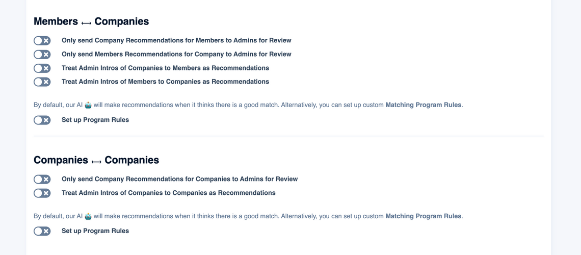 Our AI Recommendations Engine allows you to configure your own Matching Programs with custom rules. Many of our customers use this for things like custom Mentorship Programs, matchmaking for "Lunch Roulette" type programs, and Networking Recommendations.