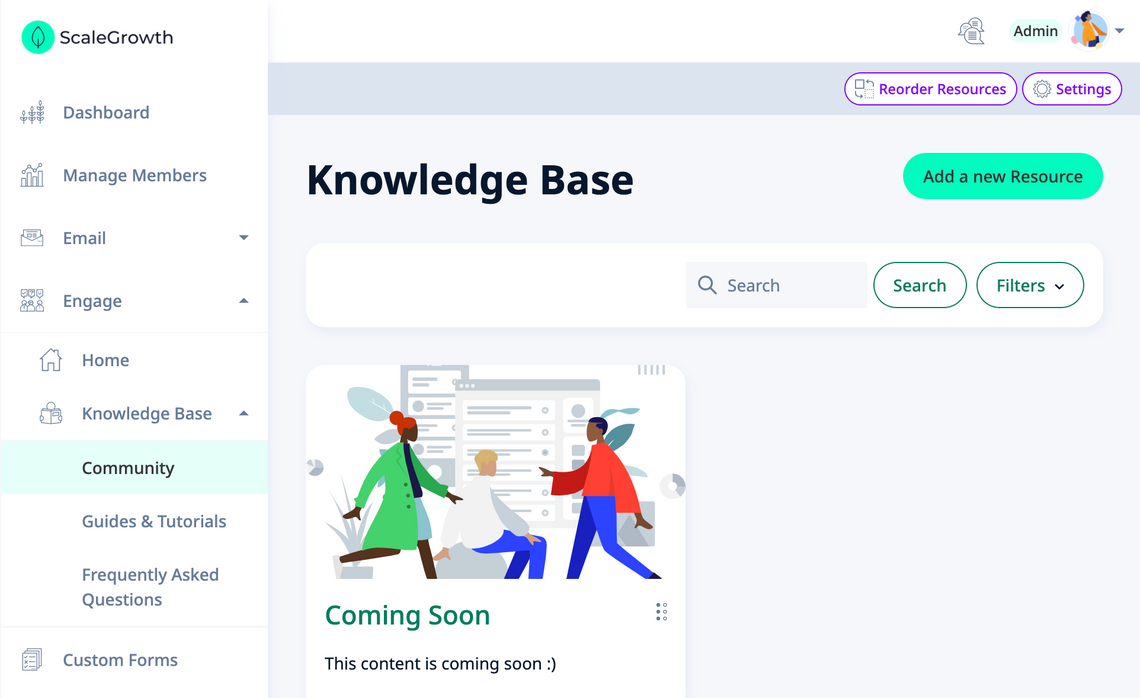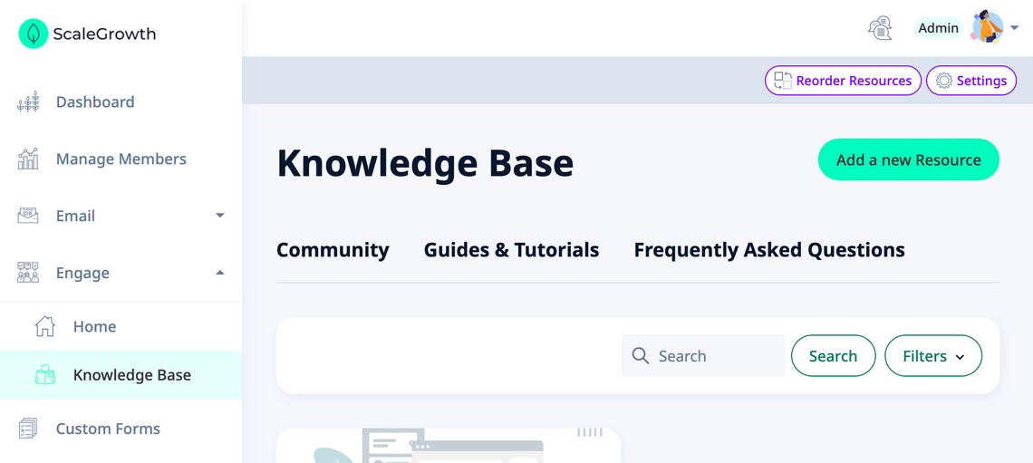 You can organize any content Spaces enabled for your ScaleGrowth solution into Folders. You can then display every Folder as one of three different types of Navigation UIs. For example, let's say you wish to create a Knowledge Base which has different sub-sections. To configure this: