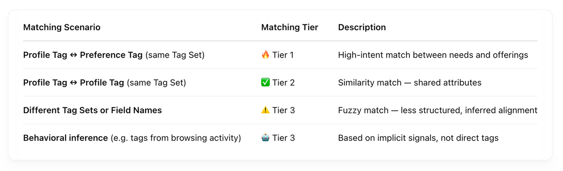 When Tag Sets are applied across Profiles, Preferences, and content, they enable powerful and structured matching logic that ties together what members offer, what they need, and what your platform provides.