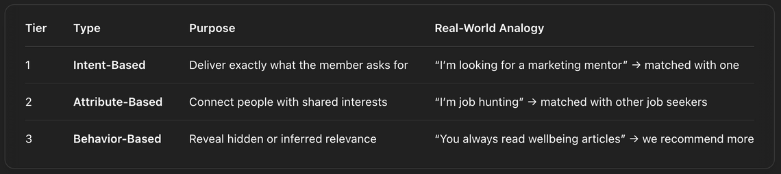 This tier taps into the unspoken and behavioral signals, the most flexible and inferred form of matching collected from how members interact with the platform. It uses natural language, activity tracking, and collaborative filtering to recommend relevant content or members – even when structured field matches don’t exist.